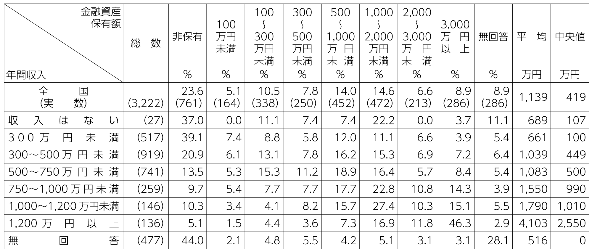 表1 年間収入別の金融資産保有額――二人以上世帯・2019年調査――
