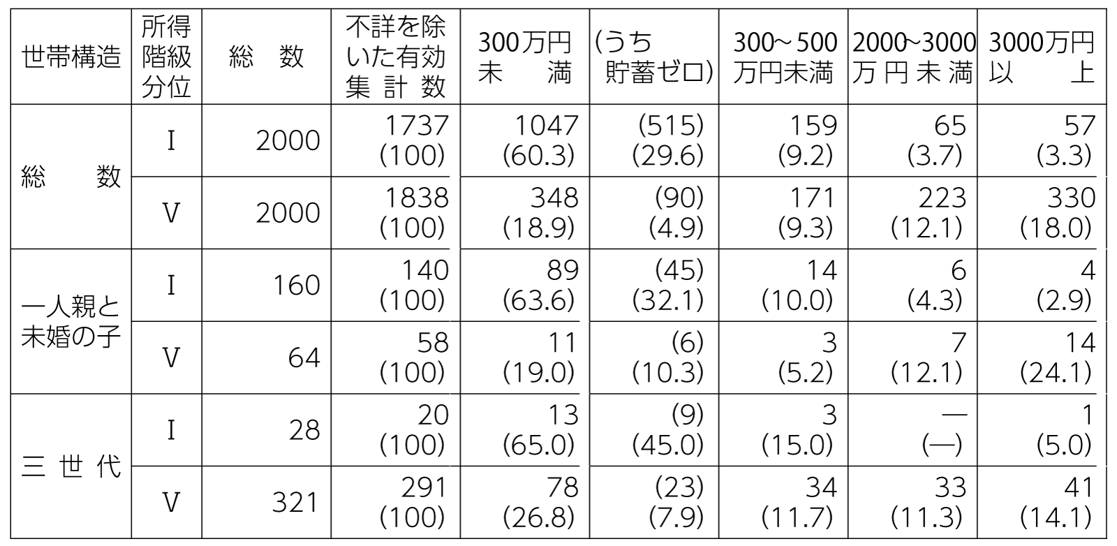 表2 所得五分位階級別・世帯構造別の平均貯蓄額の世帯数分布